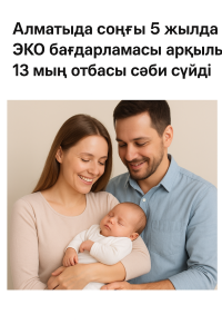 Алматы қаласында соңғы бес жыл ішінде экстракорпоралдық ұрықтандыру (ЭКО) әдісінің арқасында 13 мыңнан астам сәби дүниеге келді. Оның ішінде 5 мыңнан астам бала міндетті әлеуметтік медициналық сақтандыру (МӘМС) жүйесі арқылы өмірге келген.
