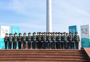 Мемлекеттік Ту көтеру сәтінде әскери хор Мемлекеттік Гимнді орындады.